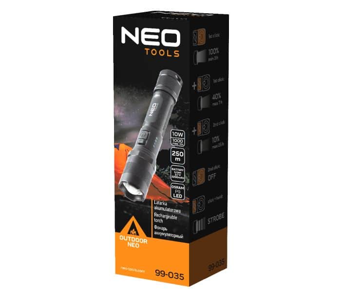 Ficklampan har 4 ljus lägen: 100%, 40%, 10% och strobe