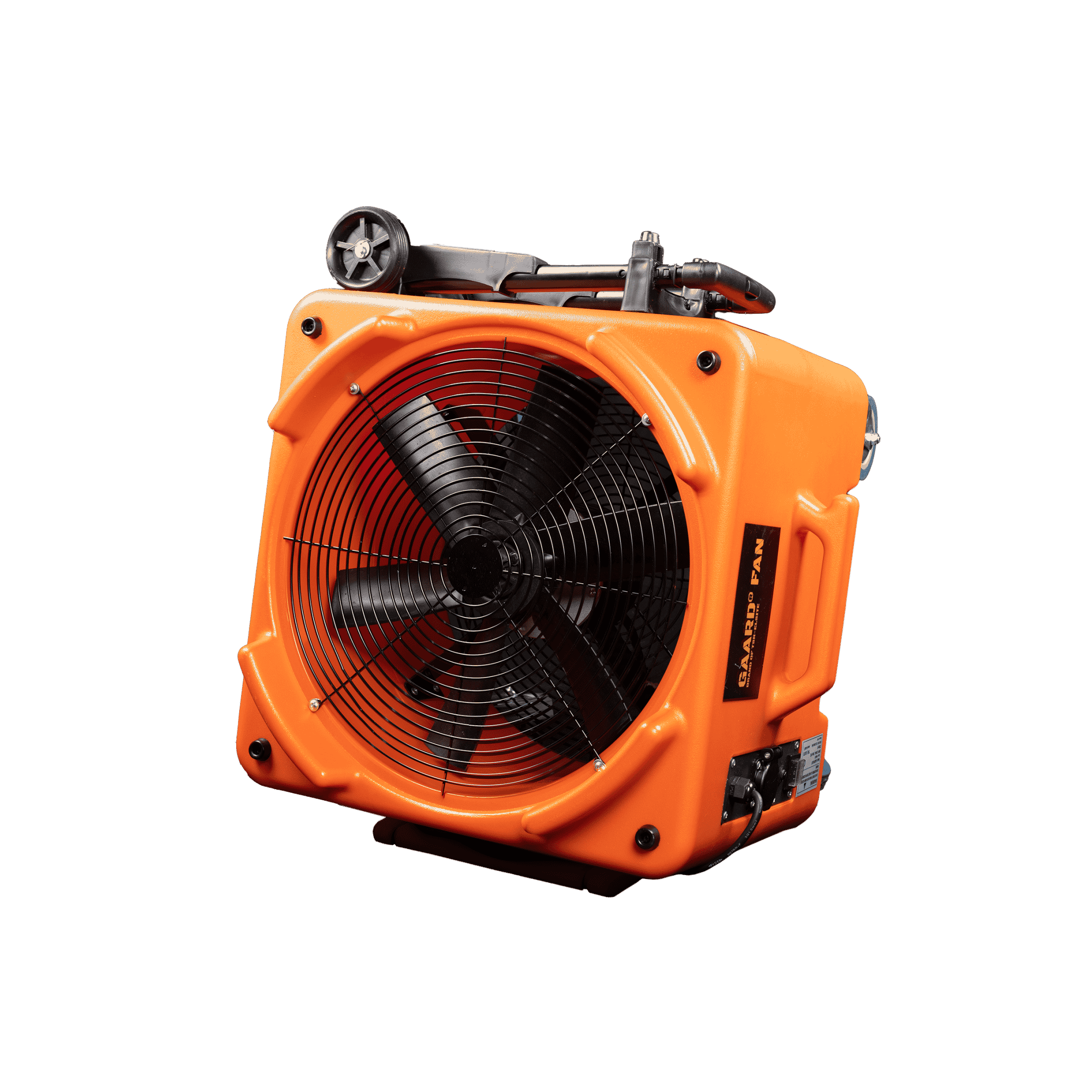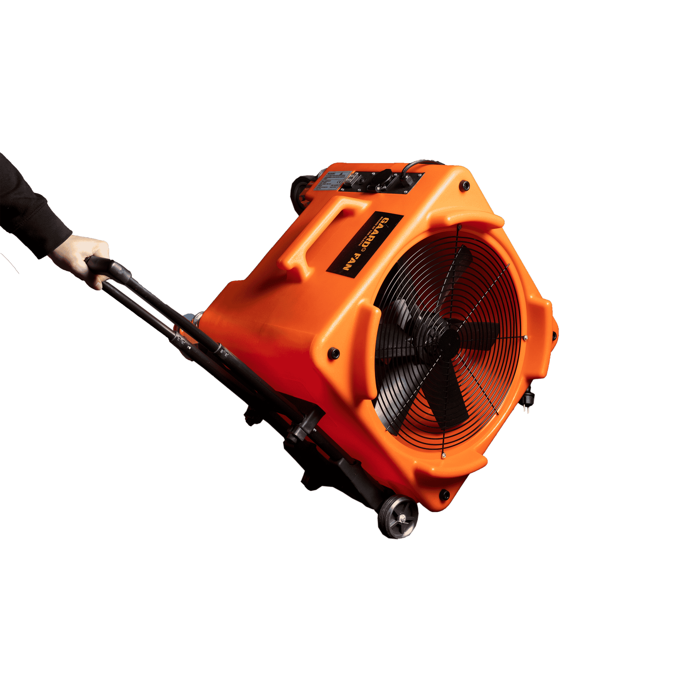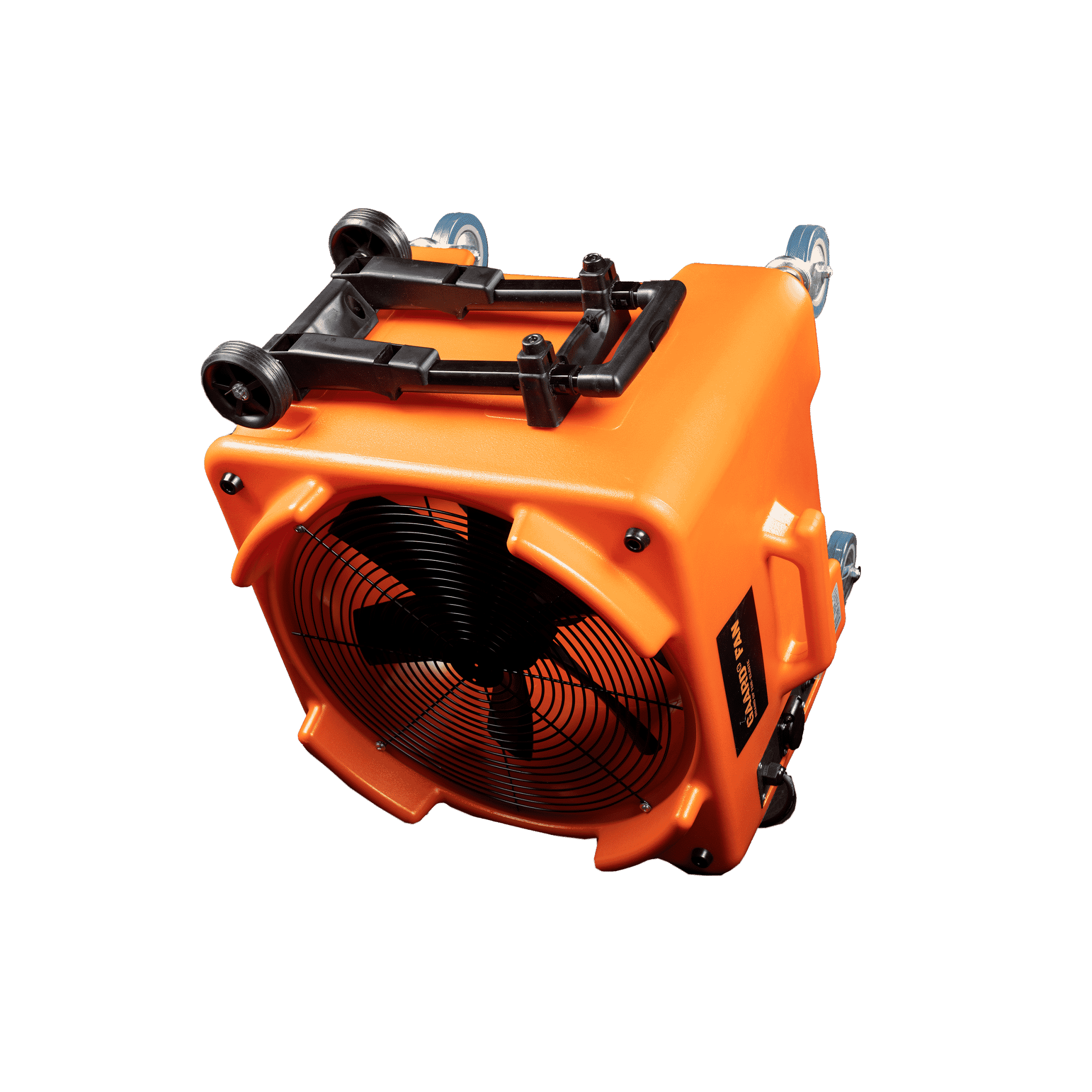 Useaan eri suuntaan suunnattavissa oleva puhallin. Puhaltimessa on pyörät ja vetokahva helppoon liikutteluun.