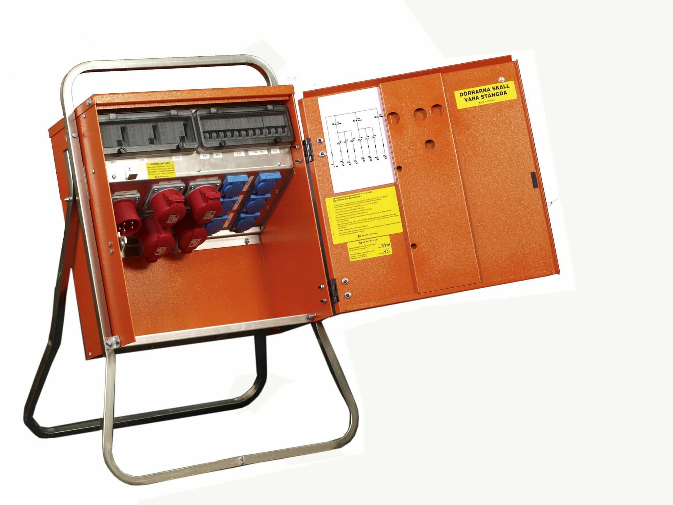 Taitettavalla ruostumattomalla jalalla varustettu 32 A keskus, joka on valmistettu jauhemaalatusta ja korroosionkestävästä 2 mm:n alumiinista. Keskuksessa on lukittava ovi, jonka takana kaikki lähdöt ovat eli se soveltuu hyvin myös alkuvaiheen työmaalle. Vankka rakenne, joka kestää kovaa käsittelyä.