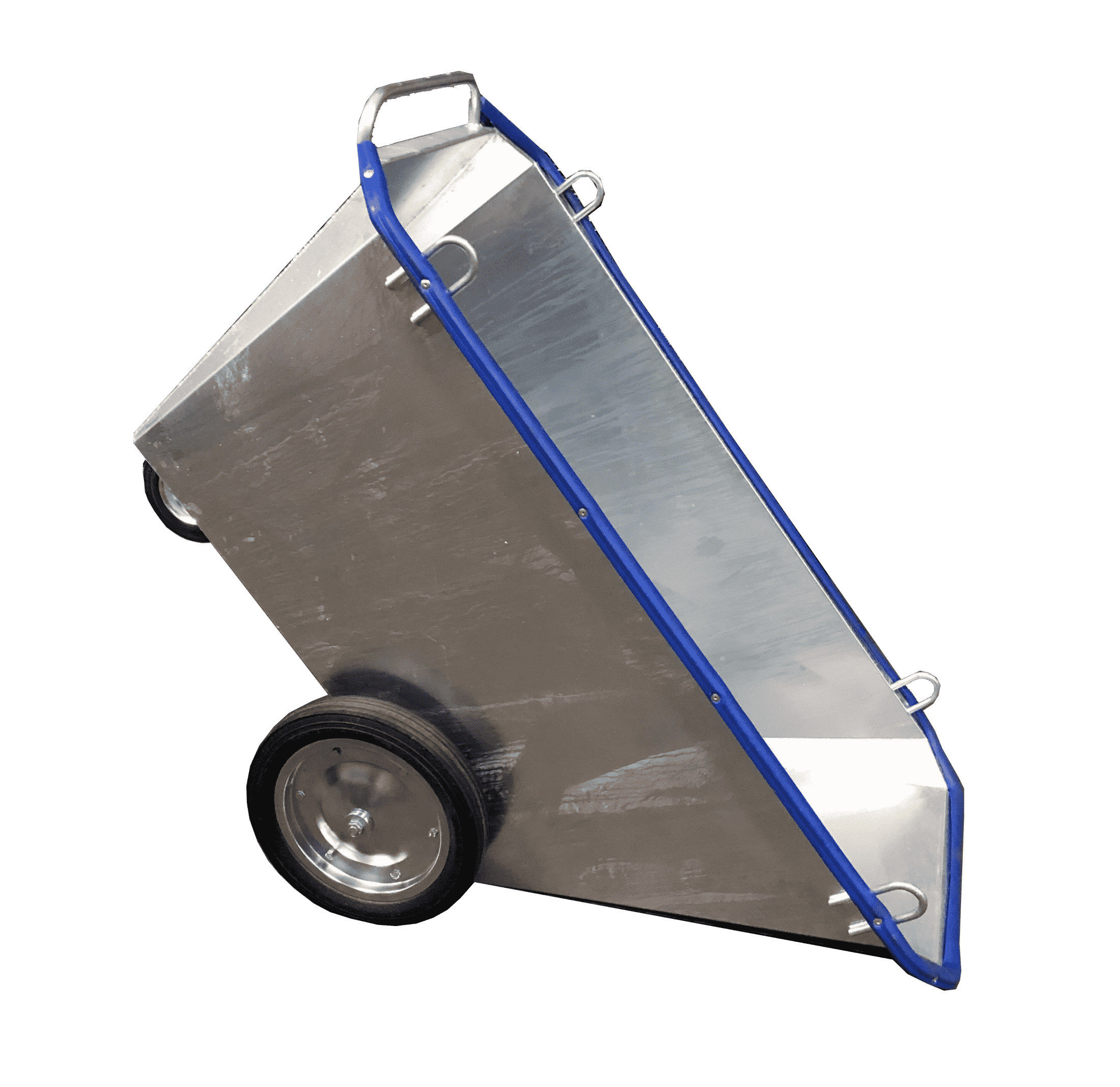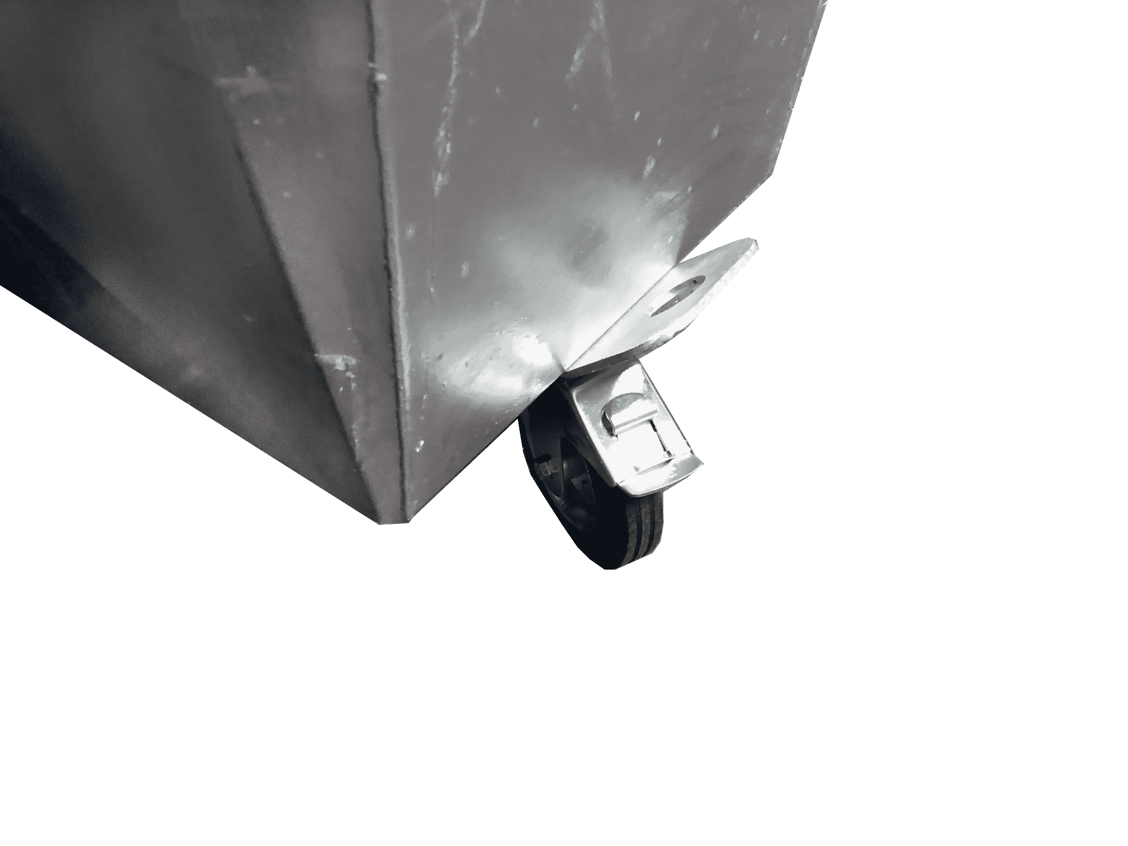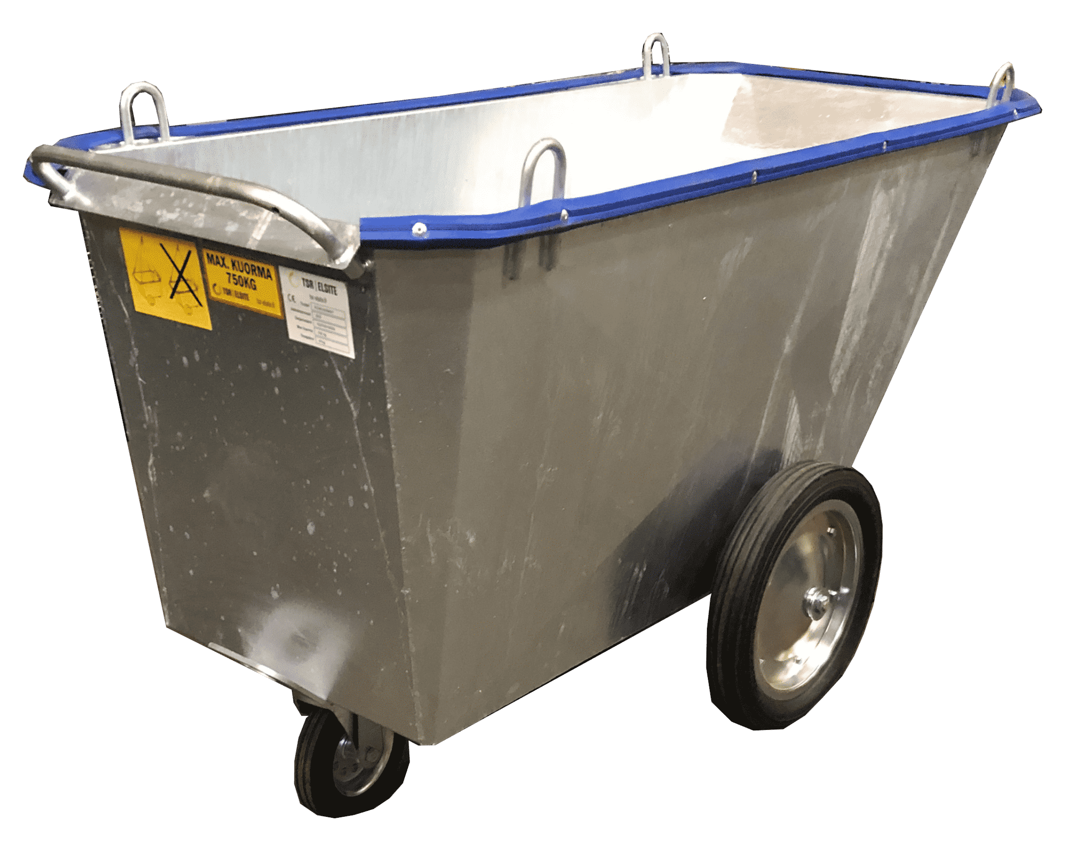 Kuumasinkitty tukeva suomalainen roskakärry, jossa on edessä kaksi isoa pyörää ja takana yksi pienempi, joka voidaan lukita. Korkealaatuiset Blicklen pyörät ovat umpikumia ja siten käytössä erittäin kestävät. Pyöriä saa myös varaosana.