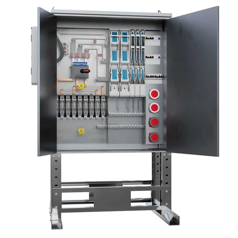 Suomessa kuumasinkitystä teräksestä valmistettu 630A työmaan pääkeskus, jossa laadukkaat eurooppalaiset komponentit. Keskuksessa on ulkoinen kotelo mittaukselle. Virtamuuntajat sisältyvät aina keskuksen toimitukseen. Keskusta voidaan siirtää pumppukärryillä, trukilla tai nosturilla.